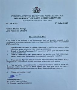 Mr. Mairiga, staff of the Federal Capital Development Authority (FCDA) has been queried, ordered to make a representation within 24 hours why he should not be disciplined for unauthorized disclosure of official documents.