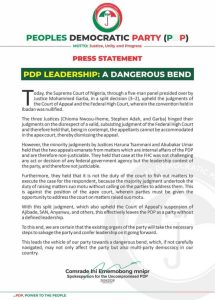 Reacting to the Apex Court judgement, Spokesperson of the ‘defeated’ factional PDP; Comrade Ini Ememobong in a press statement, described it as “…a dangerous bend”.