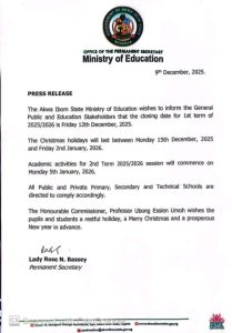 The release reads “The Akwa Ibom State Ministry of Education wishes to inform the General Public and Education Stakeholders that the closing date for 1st term of 2025/2026 is Friday 12th December, 2025.