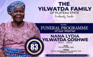 The National Chairman of the ruling All Progressives Congress, APC, Prof Nentawe Yilwatda has announced the funeral of her mother, Nana Lydia Yilwatda Goshwe who passed on recently.