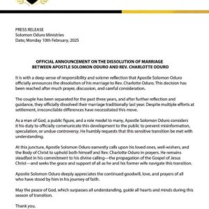 Apostle Oduro’s statement, released on Monday, February 10, 2025, revealed that the couple had been separated for three years and officially dissolved their marriage traditionally last year.