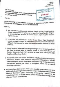 The Independent National Electoral Commission, INEC, has confirmed receipt of petition from constituents seeking to recall the senator representing Kogi Central Senatorial District, Sen Natasha Okpoti-Uduaghan.