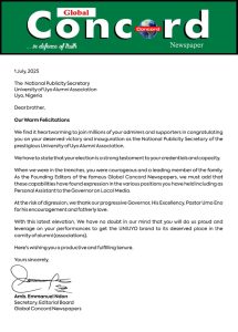 In a congratulatory letter signed by Amb. Emmanuel Ndon, Secretary of the Editorial Board, the newspaper hailed Thomas’s elevation as “a strong testament to [his] credentials and capacity,” recalling his days as a courageous and leading member of the founding editorial team at Global Concord.