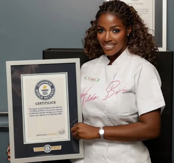 Akwa Ibom-born renowned chef, Hilda Baci has officially received her Guinness World Record (GWR) plaque for largest jollof rice pot.