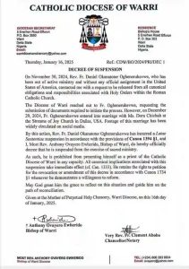 In a Decree of Suspension dated Thursday, 16th January, 2025 signed by the Bishop of Warri; Most Rev. Anthony Ovayero Ewherido, and Chancellor/Notary; Very Rev. Father Clement Abobo, the embattled clergy has been prohibited from presenting himself as the priest of the Diocese of Warri.