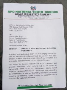 The statement captioned ‘Immediate and Irrevocable Dismissal From Office’ read “Following a comprehensive review and wide-ranging consultation with the leadership of the National Youth Caucus, NYC, Akwa Ibom State Chapter, I hereby issue this formal notice of your immediate and irrevocable dismissal from the office of Publicity Secretary”.