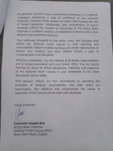 “Your continued disregard for the ethics, unity, and discipline that define the National Youth Caucus is both alarming and unacceptable. Despite multiple warnings and ample opportunities to amend your conduct, you have wilfully chosen a path of insubordination and disruption.