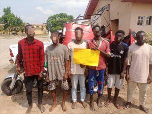 On 20th January 2025, at about 16:59hrs, acting on credible intelligence, operatives of the Command apprehended the following suspects: Ubong Dominic Ekong, ‘M’, Salisu Musa, ‘m’, Baba Tella ‘m’, Robert Ezekiel James, ‘M’, Eze Joseph Chibuike, ‘M’ and Abubakar Sadiq ‘m’. The operation led to the recovery of a stolen tricycle with registration number A/T/09230 UYY. Investigations revealed that Ubong Dominic Ekong had robbed the tricycle on 17th January 2025 and attempted to sell it to Abubakar Sadiq and Salisu Musa. The tricycle was disassembled into parts but was recovered and secured for further investigation. Efforts are ongoing to uncover other members of the syndicate and trace additional stolen items linked to their operations. All the suspects will appear in court.