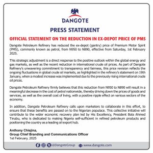 Dangote Petroleum Refinery has reduced the ex-depot (gantry) price of Premium Motor Spirit (PMS), commonly known as petrol, from N950 to N890, effective from Saturday, 1st February 2025.
